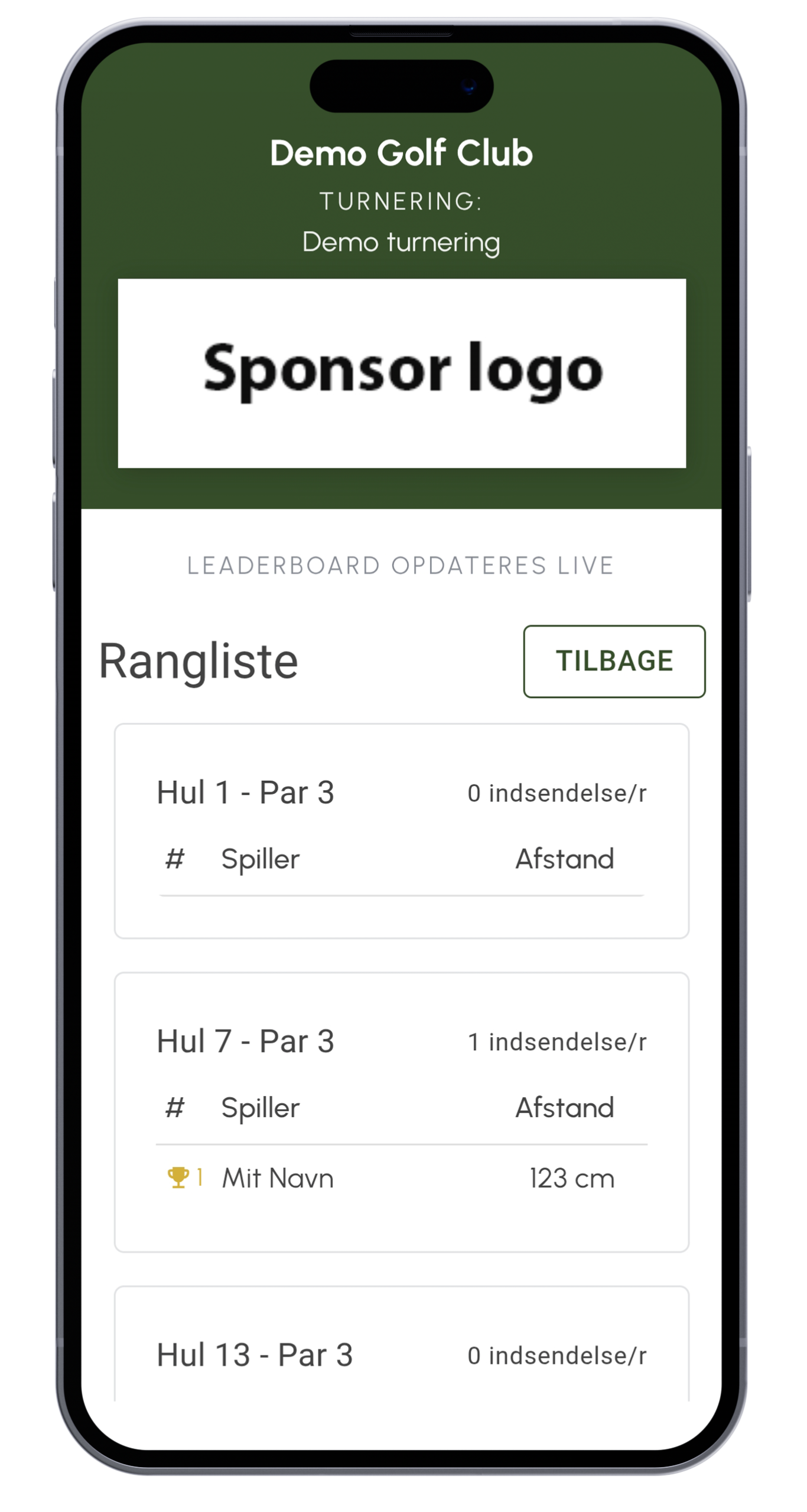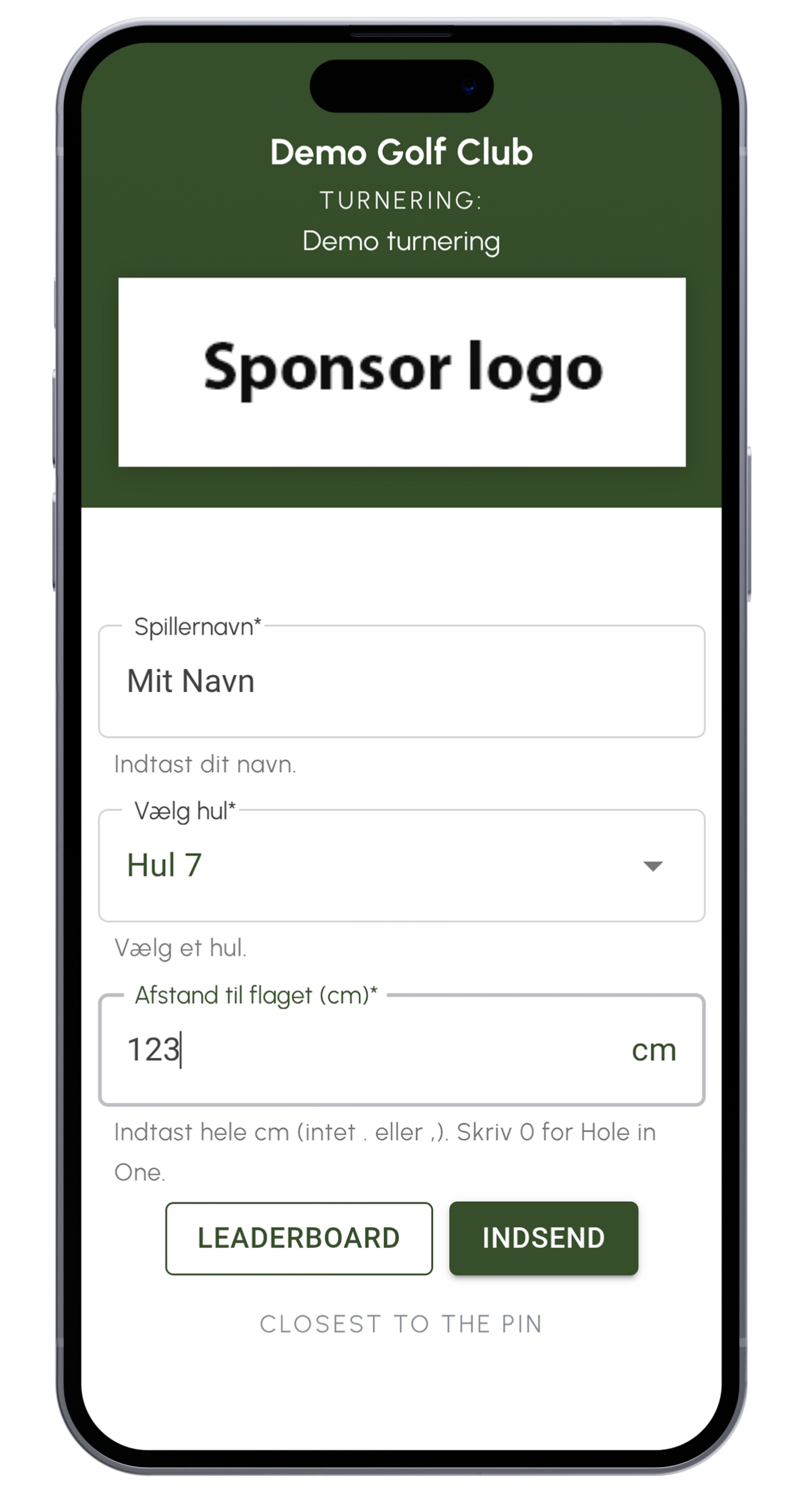 Når du indsender et resultat, gemmer vi det inberettede navn og afstand til turneringens resultatliste. Vi bruger det ikke til tracking eller marketing.